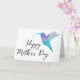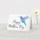 Diese Grußkarte zeigt eine blaue und lila Hummingvogelillustrierung mit den Worten "Muttertag Glücklich" auf der Vorderseite und den Innengrüßen "Danke, dass du die phantastischste Mama bist", die geändert oder entfernt werden kann.