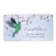 This girly shiny business card features a green hummingbird with dusky pink cherry blossoms on a shimmering background.