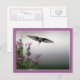 Diese Karte zeigt ein einzigartiges Foto eines Kolibri, der über einer Blume schwebt.