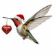 "hummingbird wearing red santa hat", "holding heart christmas decoration", "red love shaped tree ornament", "flying humming bird in flight", "ruby throated throat", "christmassy funny humorous humor", "cute wildlife birds fly", "hummer birding nature animals", "merry xmas bird lovers fans", "romantic beak hanging animal"