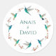 Pretty wedding sticker featuring a watercolor wreath of hummingbirds and botanical branches. The font size and font style can be changed by clicking on "Edit design". All hummingbird images are taken from original watercolors.