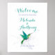 Dieses wunderschöne, individuell gestaltbare Wedding Sign Hotel besticht durch ein zartes, silbergraues Design mit einem aquamarinen und türkisfarbenen Kolibri-Kunstdesign, das ein sanftes romantisches Ambiente mit einem Vintagen und modernen Look schafft. Wenn Sie eine Hochzeit zum Thema Vögel oder Garten suchen, wird dieses Kolibri-Design gut passen.