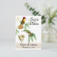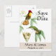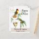 Auf dieser Save the Date Wedding Announcement Postcard steht die Vintage botanische Kunst exotischer tropischer Hummingvogel-Vögel und Habitat-Blume.