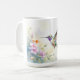 Ein farbenfroher Hummingbird, der frei zwischen den Blume fliegt. Stilstifte und Aquarell.