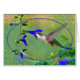 Diese rubingebeutelte Kolibri füttre an einer hellblauen Blume. Das Bild ist mit einem Buntglasdesign gerahmt.