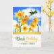 Ein wunderschöner Kolibri fliegt über den Frühlingsgarten, der mit Narzissen gefüllt ist, und macht diese Geburtstagskarte für den geborenen im Monat des März zu einer schönen Wahl in den Farben Gelb, Gold, Orange und Grün.