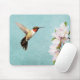 Hummingvogelmännchen mit Ruby-Kehlkopf, der neben Apfelblüten auf texturiertem Hintergrund herumschwebt