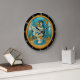 Dieses Bild zeigt eine kreisförmige Wanduhr mit schwarzem Rand und weißen Zahlen. Die Uhr zeigt eine skurrile Abbildung eines Pinguins, der Schnorchelausrüstung trägt und eine Zeitung mit dem Titel "PENGUIN TIMES" liest, während er auf einer Toilette unter Wasser sitzt. Die Unterwasserszene besteht aus blauen Fliesen, Algen, Seestern, Seepferd und Blasen, die alle in einem goldenen Rahmen untergebracht sind.