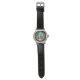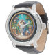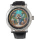 Dieses Bild ist ein Rundfunk-WATCH mit einer schwarzen Felge und weißen Zahlen, mit einer skurrilen Abbildung eines schockierten Orangenpufferfisch, der eine Schnorchelbrille trägt und eine Zeitung liest. während er auf einer Toilette sitzt. Die Szene ist Set unter Wasser mit blauen Fliesen, Algen, Seestern und einem Seepferd. Blasen schweben um den sonderbaren Charakter herum, alle in einem goldenen inneren Rahmen eingeschlossen.