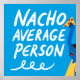 Description: This is a humorous digital illustration featuring the text "NACHO AVERAGE PERSON" in bold blue lettering against a light blue background. Below the text, two hands are shown holding plates of nachos. One hand on the left holds a single nacho chip with yellow cheese and red toppings, while the other hand on the right holds a blue plate with a pile of nachos. The illustration uses a food pun, replacing "not your" with "nacho," to playfully suggest someone is exceptional or unique. The bright colors and simple cartoonish style contribute to a lighthearted and amusing design.