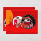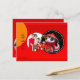 Niedliche Babyschlange in chinesischer Kleidung im Cartoon-Stil (Modell Nr. 1) scheint mit der kleinen Laterne ein rundes Fenster für Ihr Foto auf einen roten Hintergrund zu erhellen. Design auf Postkarte mit der gleichen Babyschlange + Sprechblase mit Gruß auf der Rückseite der Karte. Matching Grußkarte und mehr bald...