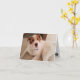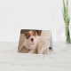 Weißer Hund auf leerer Notizkarte mit Pfotendruck