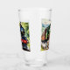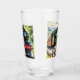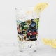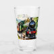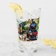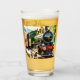 Eine nostalgische Szene eines Hundes, der die Ankunft eines grünen Dampfzugs begrüßt.