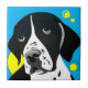Schwarz-Weiß-Pointer-Hund auf blauem Hintergrund mit gelben Kreisen