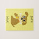 Spielender Welpe mit seinem Knochen und dem personalisierten Namen von Kind und Welpe Puzzle.