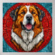 Farbenfrohe und künstlerische Illustration eines Hundes von Saint Bernard mit einem lebendigen Hintergrund mit rotem kreisförmigem Mosaikmuster. Der Ausdruck des Hundes ist glücklich und zeigt seine herausragenden Fell- und Gesichtszüge.