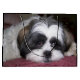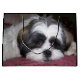 Ein niedlicher weißer und schwarzer Hund Shih Tzu, der auf einer Rose/einer rosa Decke niederlegt. Entzückendes Hundezucht-Fotografiebild Shih Tzu druckt.