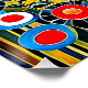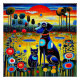 A.I. assistierte Ausdrucke einer lebendigen Szene zeigen einen stilisierten Hund und eine Katze, die sich in einer surrealen Landschaft und übertriebenen Blumendesigns, skurrilen, bunten Pflanze, unter einem atemberaubenden Sonnenuntergang mit kühnen Farben und geometrischen Mustern versammelt.