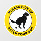 Desteis originelle schwarze Silhouette eines Hundes, der sein Geschäft macht. Der Hund ähnelt einem Golden Retriever und ähnlichen Rassen mit hängenden Ohren. Es gibt zwei personalisierbare Textbereiche. Die obere lautet: "Bitte abholen" und die untere lautet: "Nach deinem Hund". Die Farbe ist schwarz, weiß und gelb.