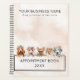 Ein charmanter Geschäftsplaner mit hübschen Hunden mit Blume Kronen auf dem Kopf. Perfekt als Terminkalender. Ihr Shop/Firmenname auf einer Seite und Kontaktinformationen auf der Rückseite. Diese süßen und hübschen Hunde mit Blume "in ihren Haaren" zeigen Ihrem Gast, wie sein Freund verwöhnt wird und wie ein Gönner in der Tierpflege behandelt wird. Illustration mit bunten Blume im Aquarell-Stil. Golden Retriever, weißes Poodle, französischer Bulldogge, Spitz und ein Dalmitist.