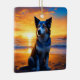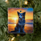 Ein Hund sitzt bei Sonnenuntergang ai art am Strand und widmet sich personalisierten Weihnachtsschmuck.