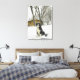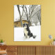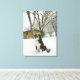 Hunde sitzen im Schnee mit Blockhütte dahinter Leinwanddruck