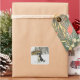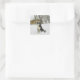 Hunde sitzen im Schnee mit Blockhütte dahinter Quadratischer Aufkleber