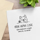 Einfache Cartoon-Darstellung eines fröhlichen Hundes, Zunge raus, Blick von hinter einer Trennwand. Nur der Kopf und die Vorderpfoten sind sichtbar. Eine Pfote wird in einer Wellengeste aufgezogen. Passen Sie sich mit Ihrer eigenen Adresse an.