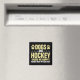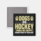 Hockey-Magnet mit Text, der Hunde und Hockey macht mich glücklich Menschen machen meinen Kopf Hurt! Außerdem gibt es einige Hockeyschläger und Hundepaws.