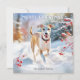 Diese elegante Weihnachtskarte zeigt einen Hund, der einen Spaziergang durch eine schneebedeckte Landschaft mit roten Beeren und immergrünen Bäumen an einem hellen Tag genießt. Oben steht der Gruß "Frohe Weihnachten" in stilvoller Schrift-Typografie, während der Text unten mit Ihrem Namen oder anderen Worten personalisiert werden kann. Die Karte ist voller Hahnencharme und ideal für Besitzer von Hundeschlitten und Hundefreunden.