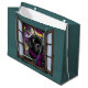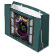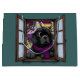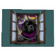 Wunderschön handgezeichneter und farbiger Welpenhund aus Neufundland in einem Winterwunderland, der durch ein schneesicheres Fenster schaut