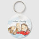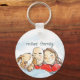 Dieser Schlüsselanhänger zeigt eine niedliche Welpe und ihre Eltern, einen kahlen Mann und eine brünette Frau. Sie können den Text anpassen.