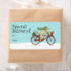 Niedlicher Cartoon-Hund mit einem grünen gestreiften Winterhut und einem langen Schal, der ein rotes Fahrrad reitet. Das fröhliche rote Eichhörnchen fährt im Fahrradkorb. Diese beiden sind auf dem Weg Weihnachtsgeschenke an Freunde zu liefern. Diese skurrilen und keuchenden Geschenketiketten werden Ihren Urlaubsgeschenken eine zusätzliche persönliche Touch verleihen.