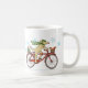 Whimsical Winter Kaffee Tasse. Niedlicher Cartoon-Hund mit einem grünen gestreiften Winterhut und langem Schal und Tretboot auf einem roten Fahrrad. Das fröhliche rote Eichhörnchen fährt im Fahrradkorb. Diese beiden sind auf dem Weg Weihnachtsgeschenke an Freunde zu liefern. Dieses humorvolle Design ist ein perfektes Urlaubsgeschenk.