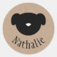 Namensaufkleber/-tag mit einem schwarzen Hundesymbol auf einem Bild mit braunem Papierhintergrund.