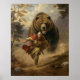 A man in medieval clothing flees in terror from an enormous bear that is chasing him through a mountainous landscape. The bear's ferocious expression contrasts with the man's panic-stricken face as he runs through a dusty trail. The scenery around them depicts autumnal trees and distant valleys under a dramatic sky.