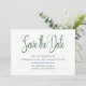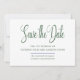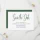 Elegantes und zeitloses Jägergrün und weiß Design. Save the Date ist in einem schönen Skripttext geschrieben. Ihre Namen, Ihr Hochzeitstermin und Ihr Standort folgen. Sie können eine zusätzliche Meldung auf der Rückseite hinzufügen.