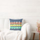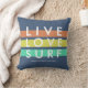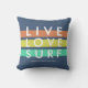 Blaues dekoratives Wurfkissen mit sonnigen Streifen in pfirsichfarbenen, minzgrünen und gelben Streifen bedruckt mit der Meldung "live, Liebe, surf". Mit Huntington Beach, Kalifornien, ausgestattet, kann der Text jedoch in die Position Ihrer Wahl geändert werden. Ideal für ein lässiges Strandhaus für alle, die Lieben surfen.