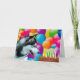 Schwarz-Weiß sibirischer Husky sieht hungrig auf den Schokoladenkuchen und Kerzen mit einem Hintergrund voll von Ballons Hund Liebhaber Geburtstagskarte. Beeil dich, die Kuchenschokolade zu essen, ist nicht gut für ihn!