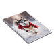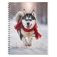Husky Hund läuft im Winterwald mit einem roten Schal.