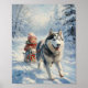 Ein Huskyhund zieht ein glückliches und lächelndes Kind auf einer schluckigen, schneebedeckten Landschaft.