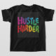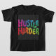 Der T - Shirt zeigt den Text "Hustle Harder" in einem spielerischen, blasen-buchstabengetreuen Stil mit Regenbogenfarben. Das Design ist lebendig und auffallend, mit einer Touch von Launen.