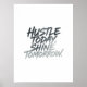 Ein auffallendes motivierend Typografie-Design mit der kraftvollen Botschaft: "Hustle Today, Shine Tomorrow" Das Zitat wird in einem fett-pinselskriptartigen Stil mit einem coolen metallischen Farbeneffekt dargestellt, der den Übergang von der harten Arbeit (dunkler "Hustle Today") zur Belohnung (heller, glänzender "Shine Tomorrow") perfekt veranschaulicht. Dieses Design ist eine tägliche Erinnerung, die Engagement und harte Arbeit jetzt zu Erfolg und Glanz in der Zukunft führen. Ideal für Unternehmer, Studenten oder jeden, der sich auf die Erreichung seiner Ziele konzentriert.
