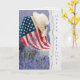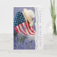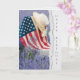 Frauenhut und amerikanische Flagge auf weißem Korbstuhl im Feld der russischen Magie mit abgerissenem Kanteneffekt zum Geburtstag