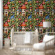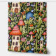 Eine niedliche Tapete mit einer kleinen Villa, Pilzen und Blume in Schwarz, Orange, Rot und Bräune in Erdtönen.