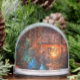 Eine gemütliche, rustikale Hüttenszene mit einem Schreibtisch mit Pfauenfedern in einer Kupfervase, blauen Töpfern, Büchern und einer Kerosin-Lampe. Mondlicht wird durch Winterfrost auf Fensterscheiben gesehen.