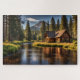 Eine Sommerhütte in einem Kiefernwald neben einem Fluss, mit einem Berg im Hintergrund, schafft ein schönes Puzzle.