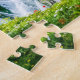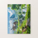 Atemberaubende Abbildung einer Hütte in den Alpen in der Nähe eines Wasserfalls, umgeben von üppig grünen Bergen. Ideal für Natur- und Reisedesigns.
