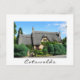 Postkarte einer Hütte mit Strohdach in typischer Cotswolds-Architektur mit wunderschönem Garten in Chipping Campden, England, Vereinigtes Königreich mit weißer Grenze und dem Text: "Cotswolds".