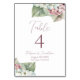 Diese romantische Blumenkarte mit Tischnummer in Aquarellfarben, Rosa und Weiß, bietet Hydrangeas. Ein zarter Strauß an Hydrangea-Blume wird oben abgebildet, ein anderer unten. Unterhalb der Tischnummer werden in der Mitte die Namen eines Musterpaares in einem eleganten Schriftart gedruckt, gefolgt von einem Hochzeitsdatum und einem Ort.